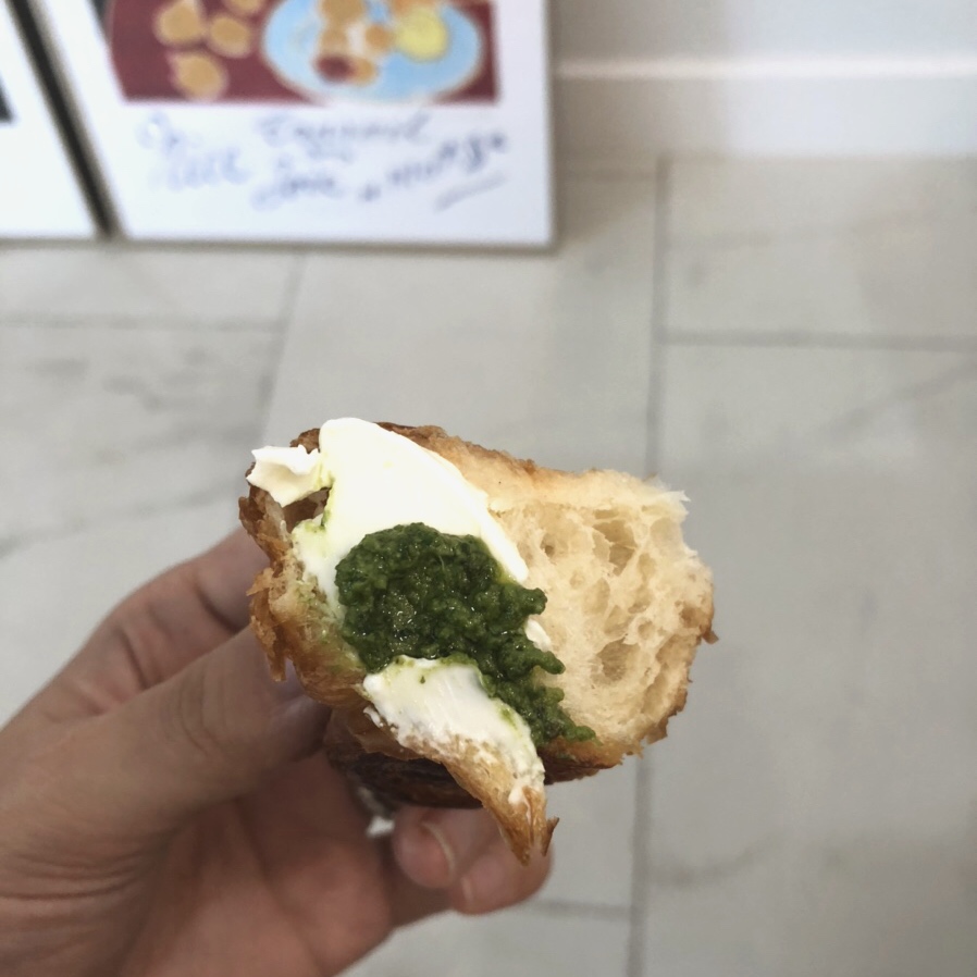 크림치즈를 0.7, 페스토를 0.3 비율로 발라 먹는 게